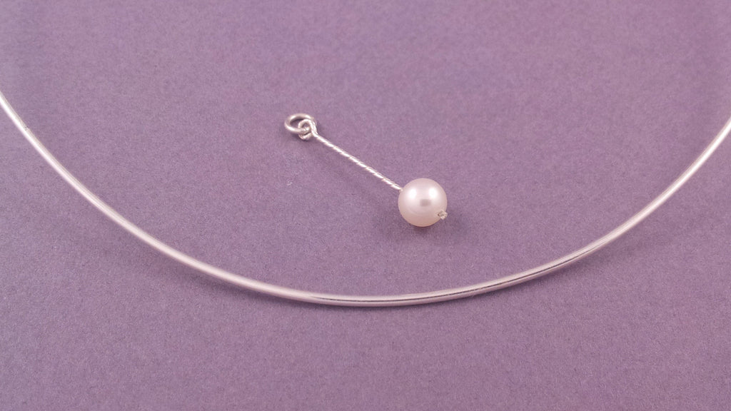 The piece inspired by the water-mother (Veen emonen in Finnish) of The Kalevala. Single bright pearl attached to a watery twisted silver stem that swims through it. In this set the water-mother swings on a silver collar. See Mother of Water Collection for more options that go well together with this necklace set. You can also find the collar necklace separately.