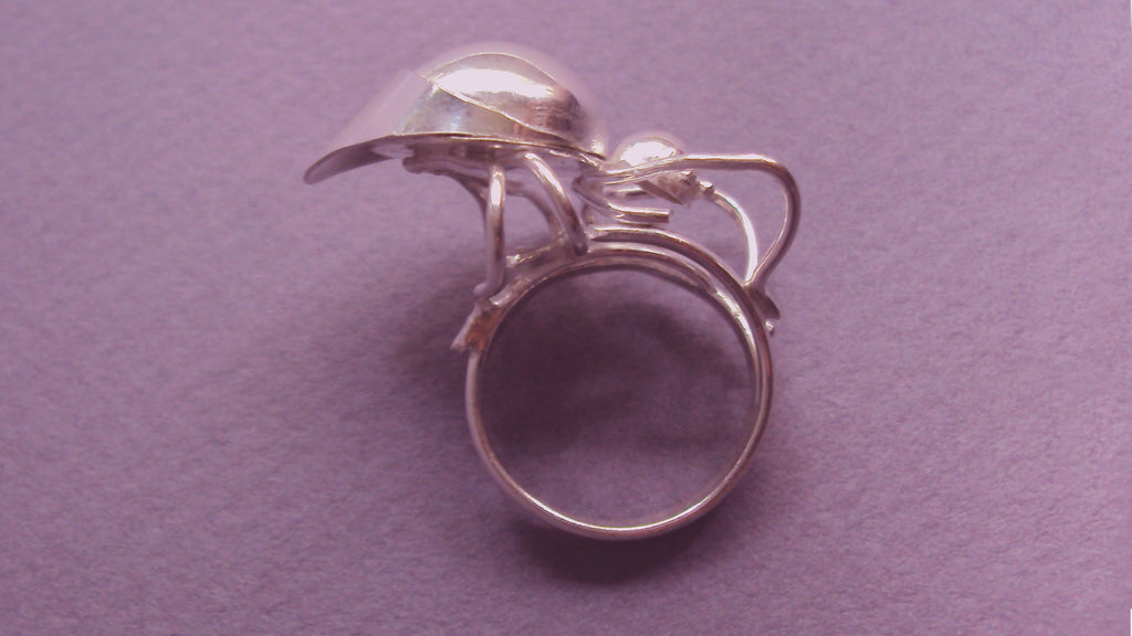 This shiny arachnid can hide things to her large abdomen. This ring is one of the most tedious ones to assemble since the legs combine the otherwise open ring to a more rigid sculpture.